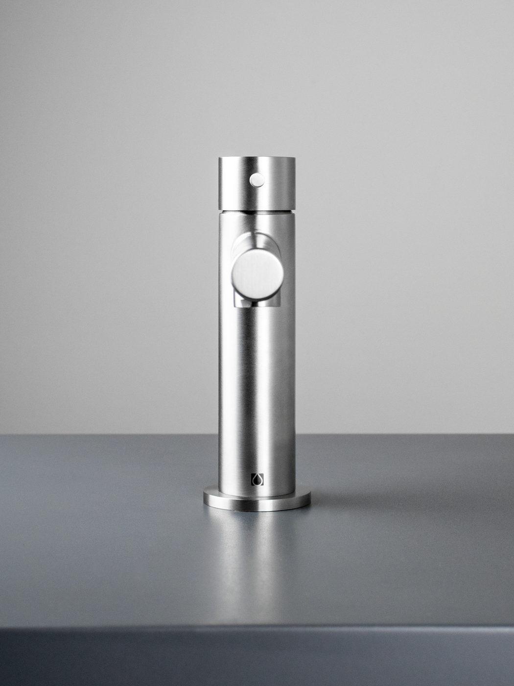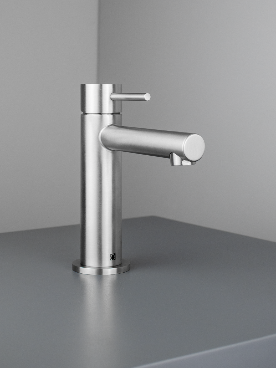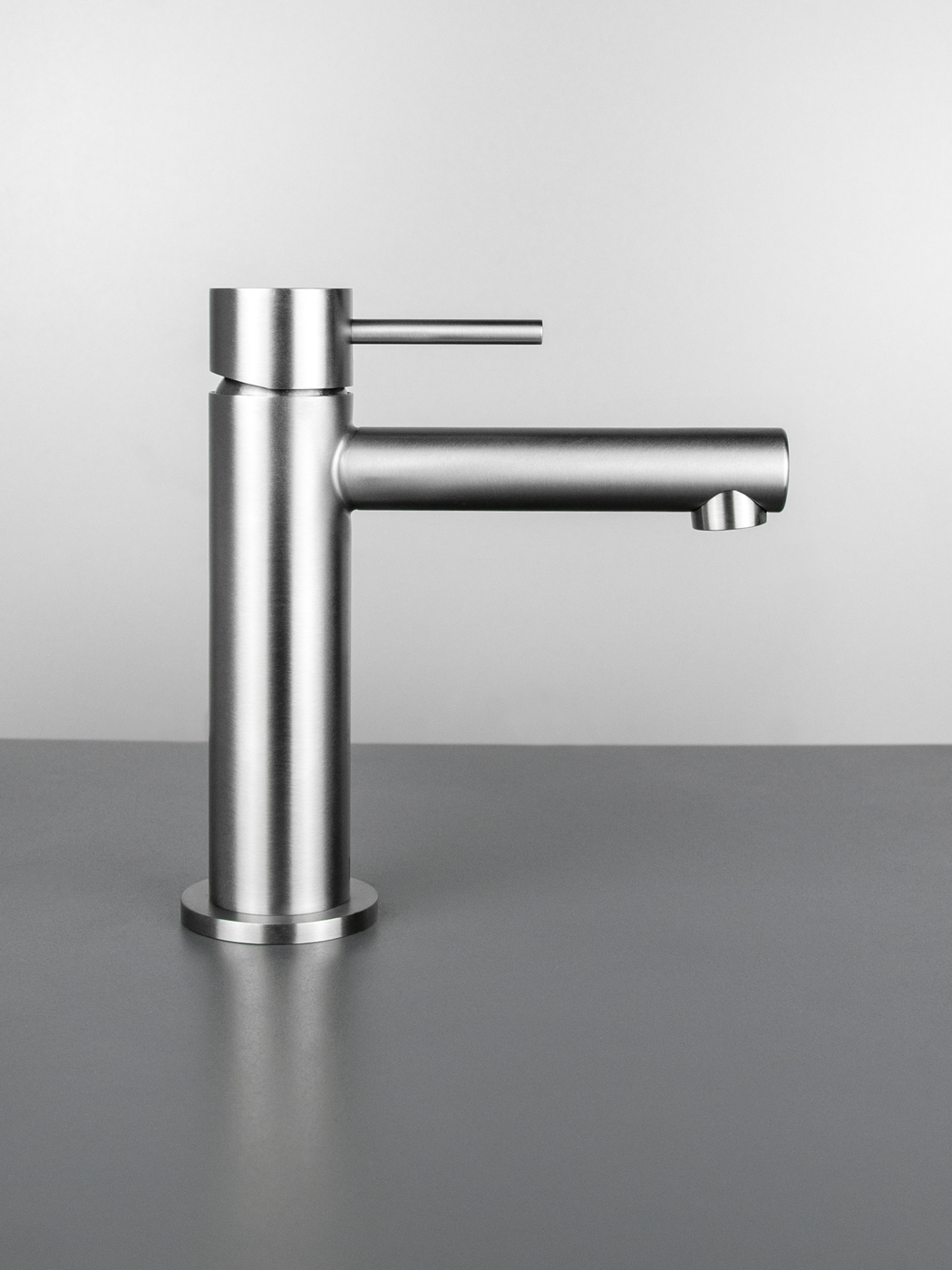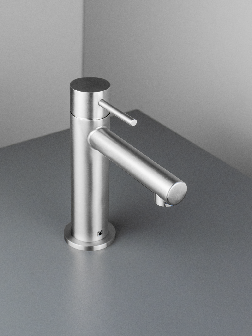 Miscelatore lavabo Ø34mm inox 316L S/SCARICO Bocca l. 10,5cm con aeratore anticalcare M16,5×1 Flessibili di collegamento G3/8”