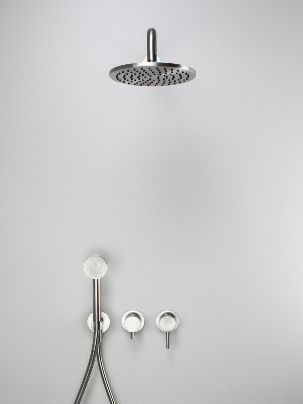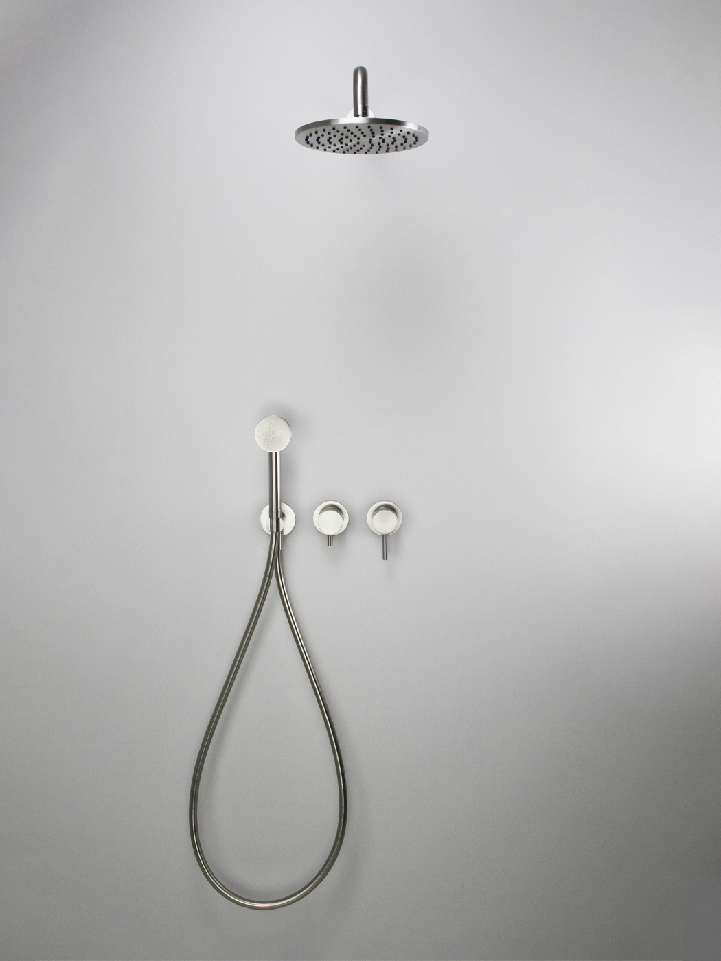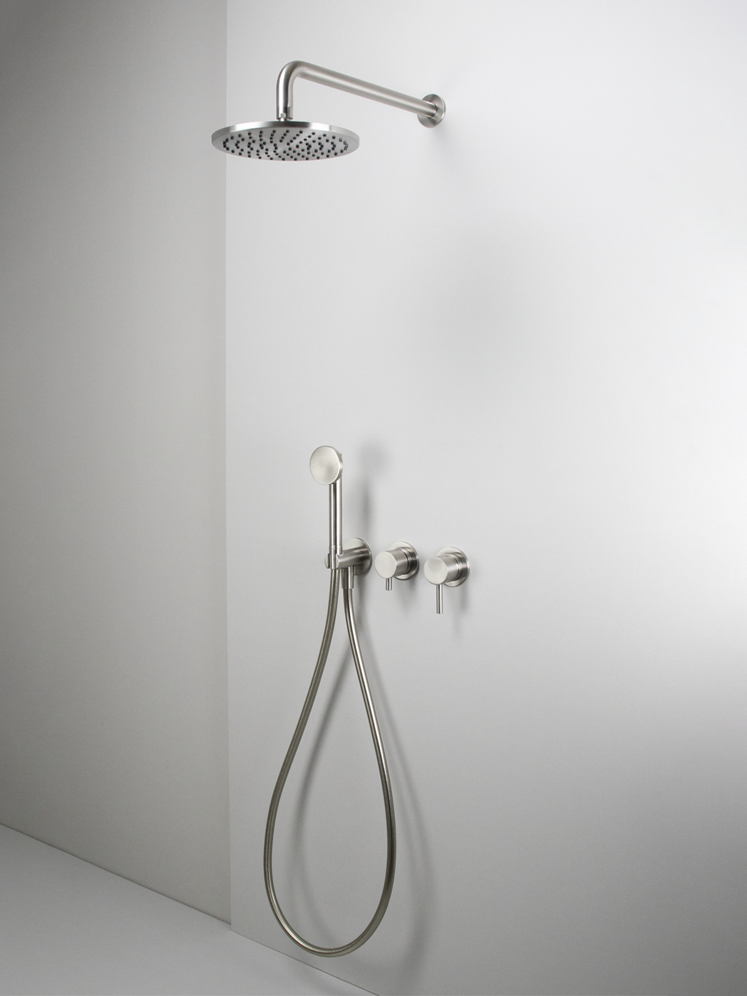Kit doccia 2 vie con braccio doccia a parete 35cm, soffione Ø250, miscelatore monocomando Ø45mm con deviatore rotativo e doccetta in acciaio inox 316L