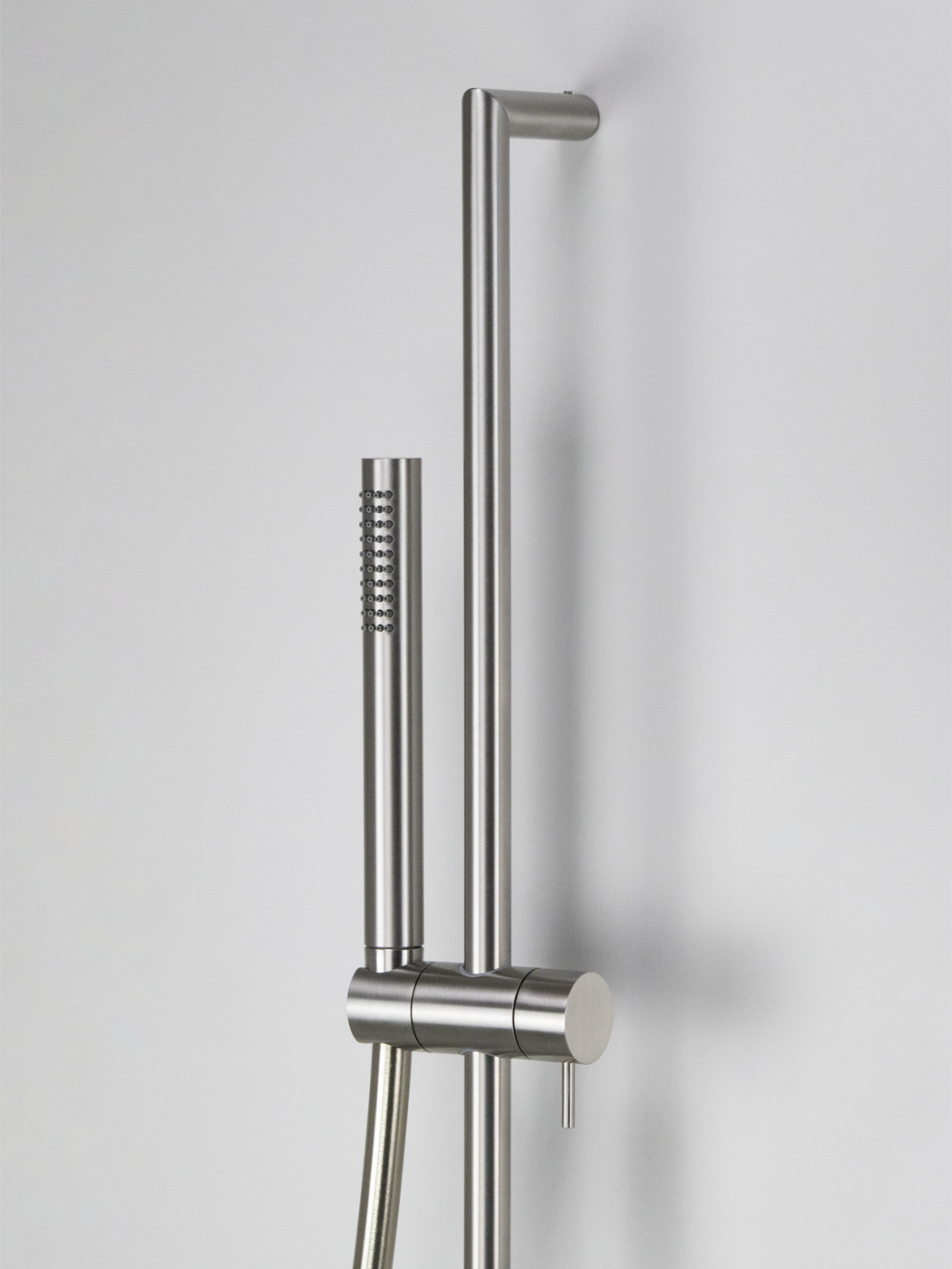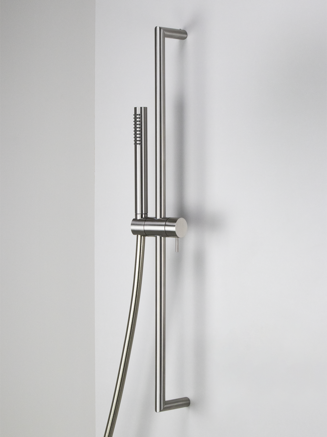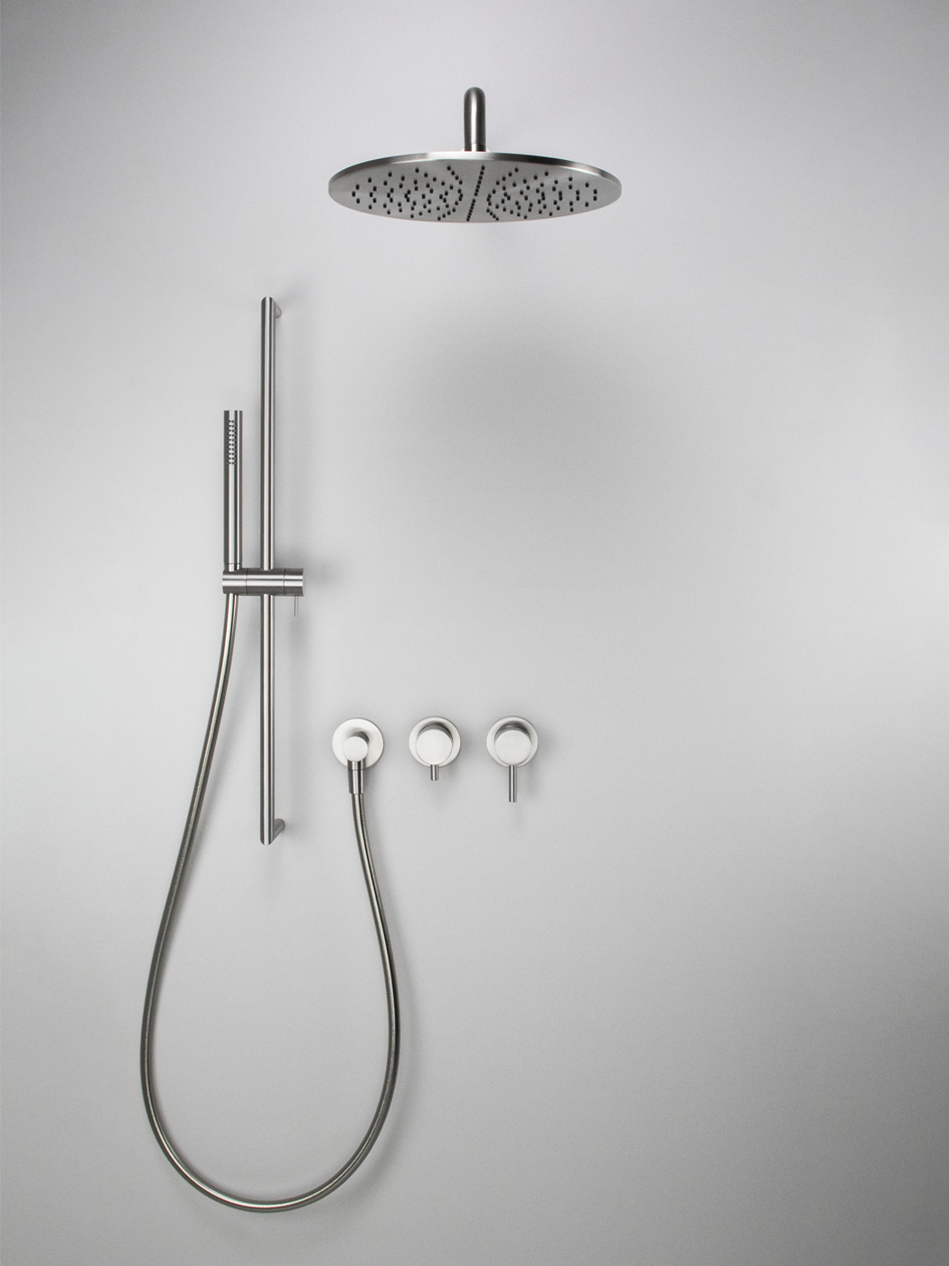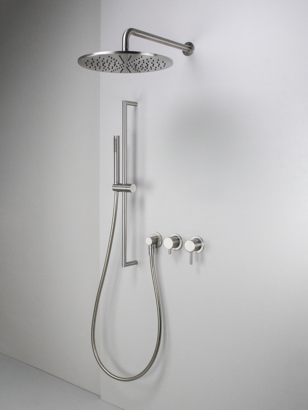 Kit doccia 2 vie con braccio doccia a parete 35cm, soffione Ø300, miscelatore monocomando Ø45mm con deviatore rotativo e asta saliscendi con doccetta in acciaio inox 316L