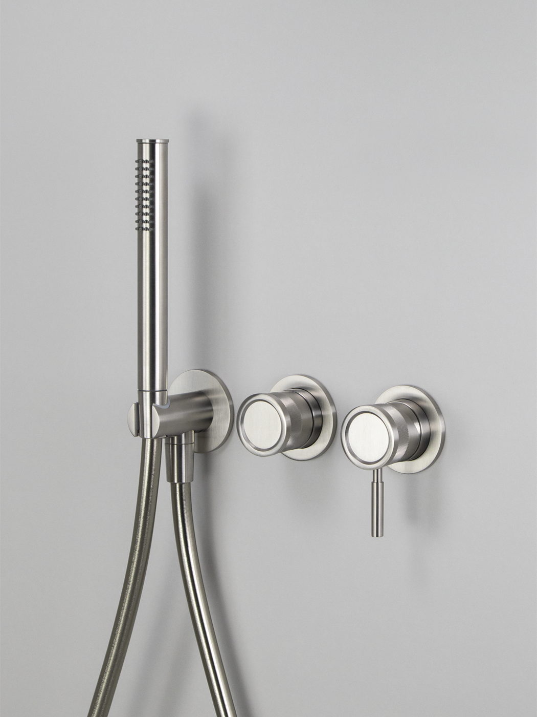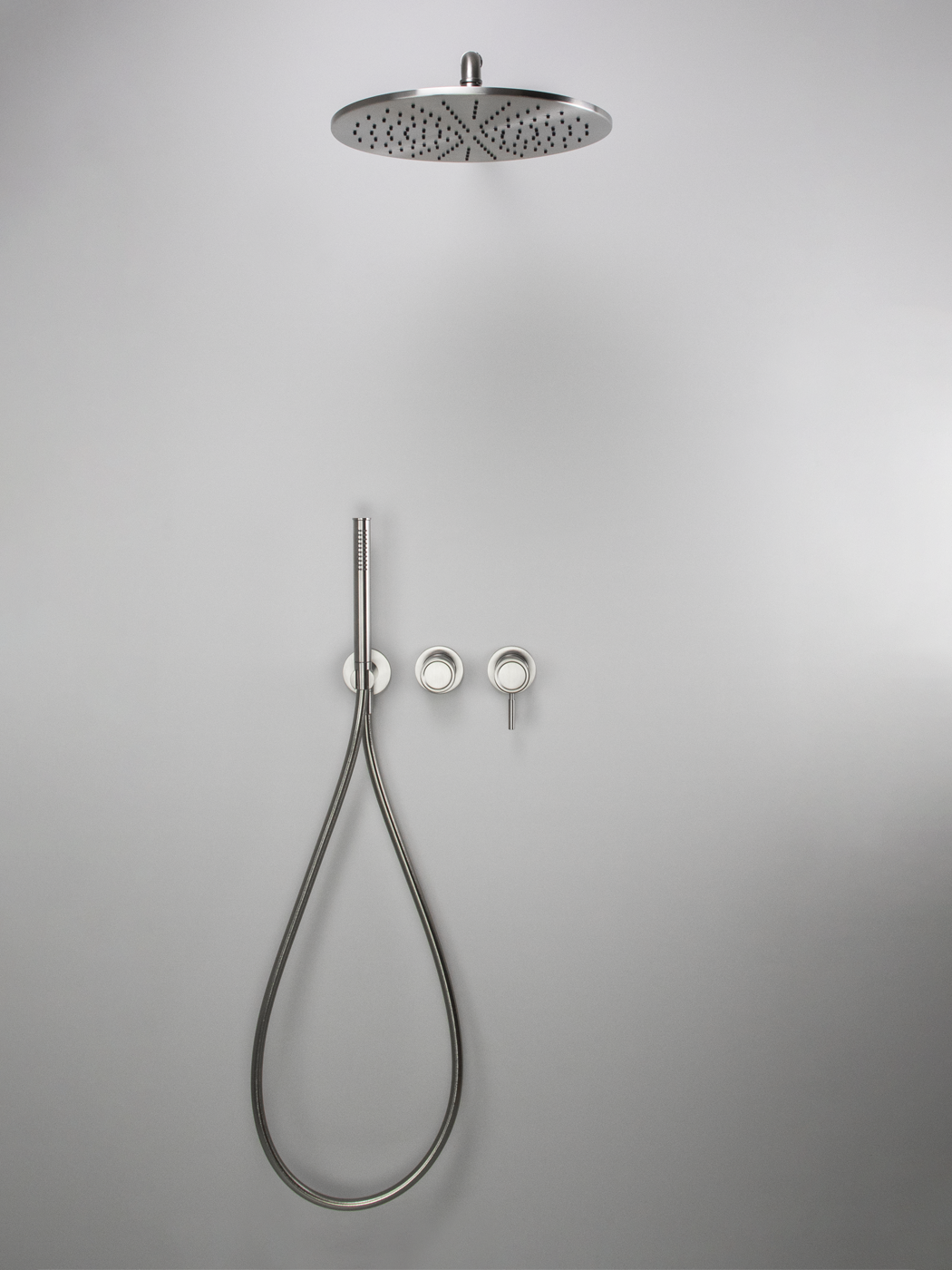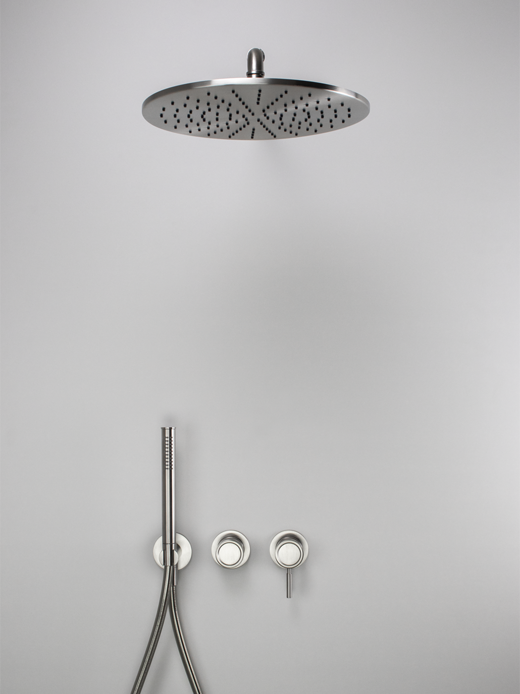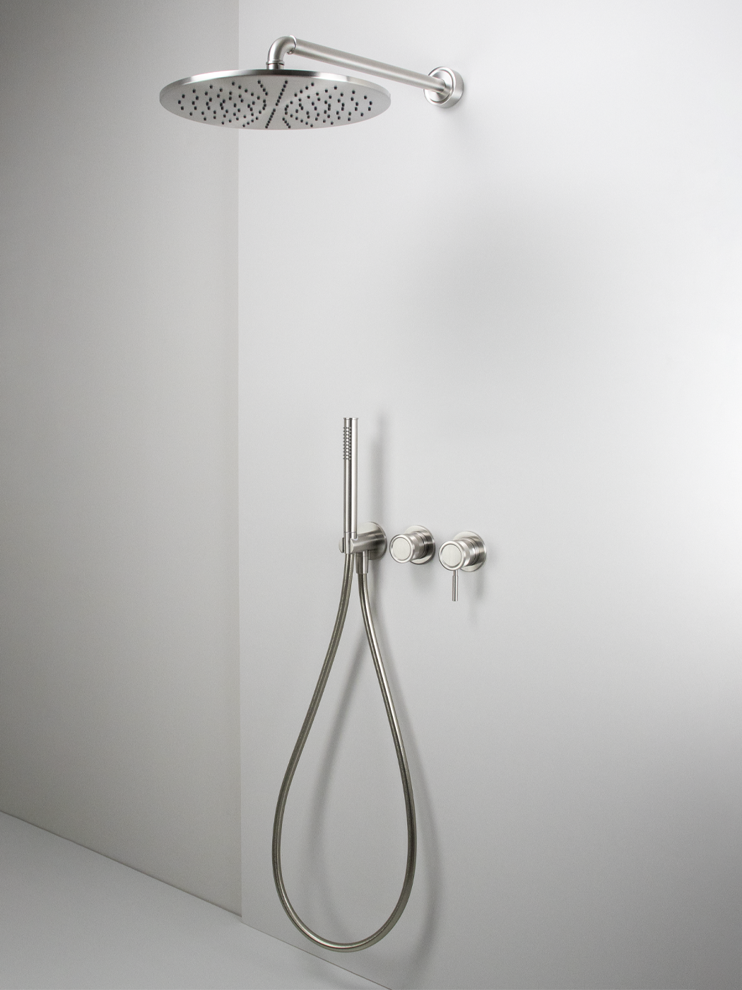 Kit doccia 2 vie con braccio doccia a parete 40cm, soffione Ø300, miscelatore monocomando Ø45mm con deviatore rotativo e doccetta in acciaio inox 316L