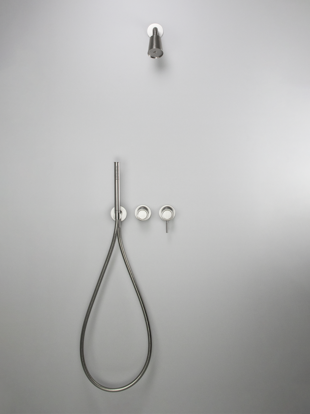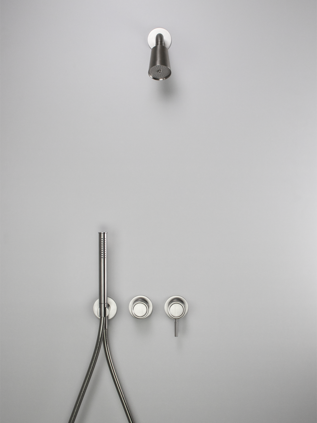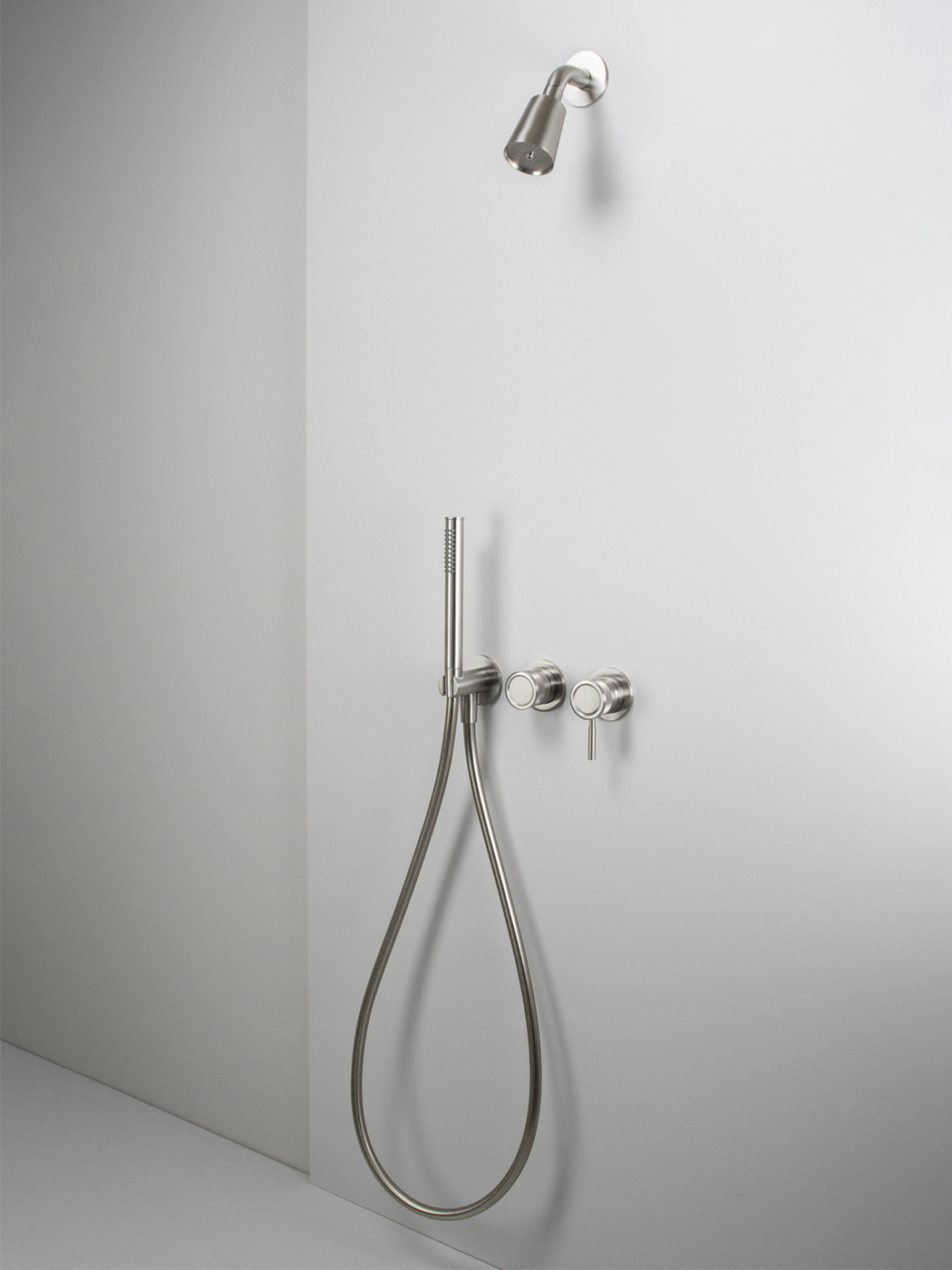 Kit doccia 2 vie con soffione a campana Ø60, miscelatore monocomando Ø45mm con deviatore rotativo e doccetta in acciaio inox 316L
