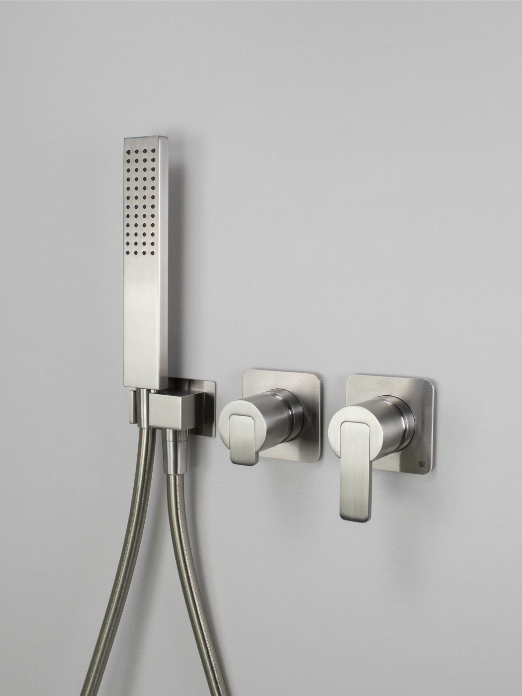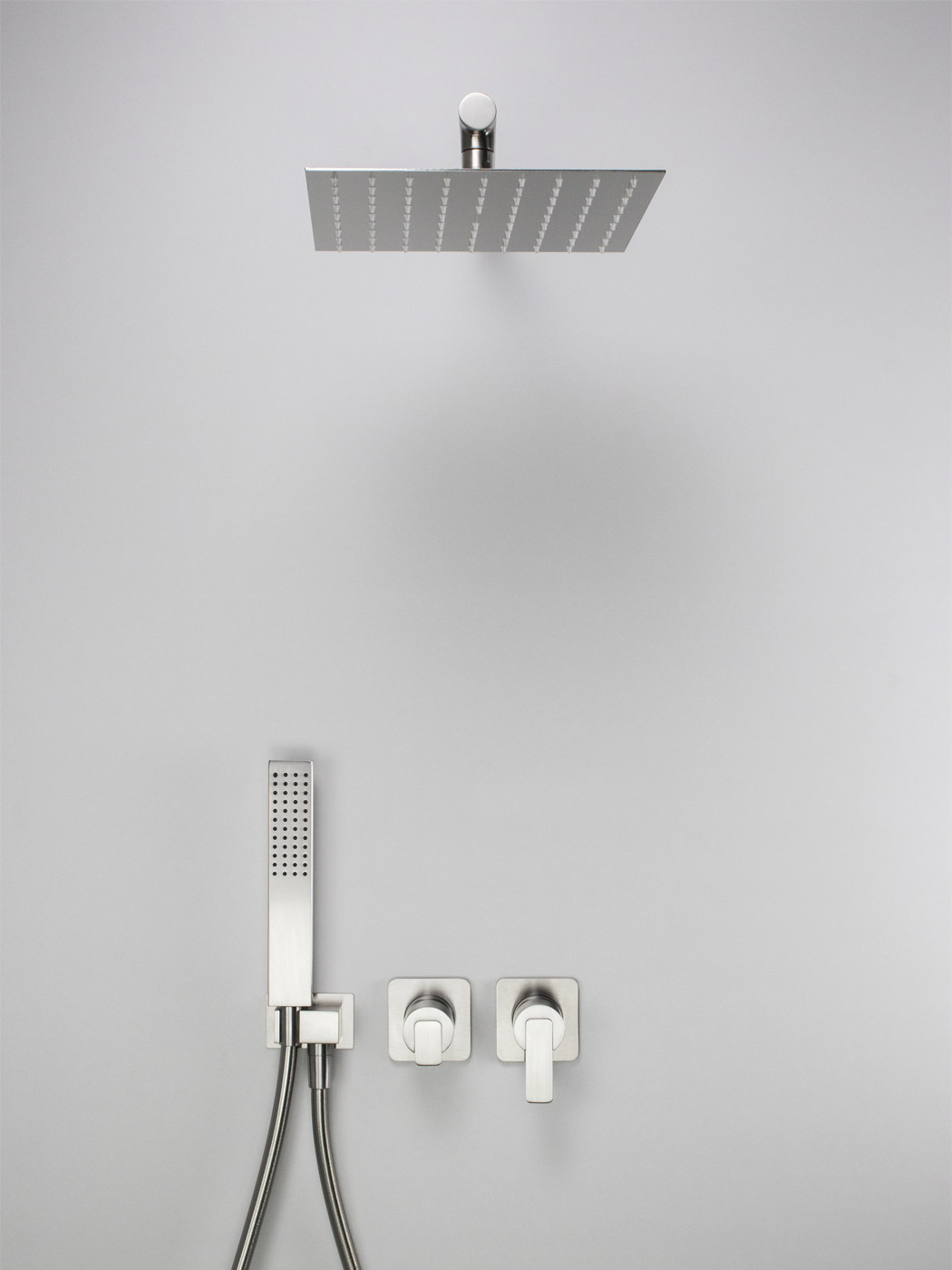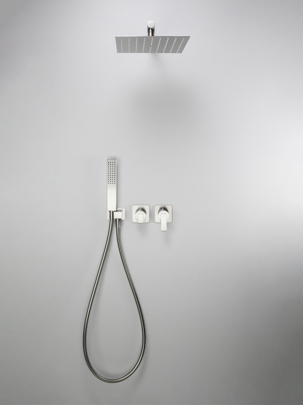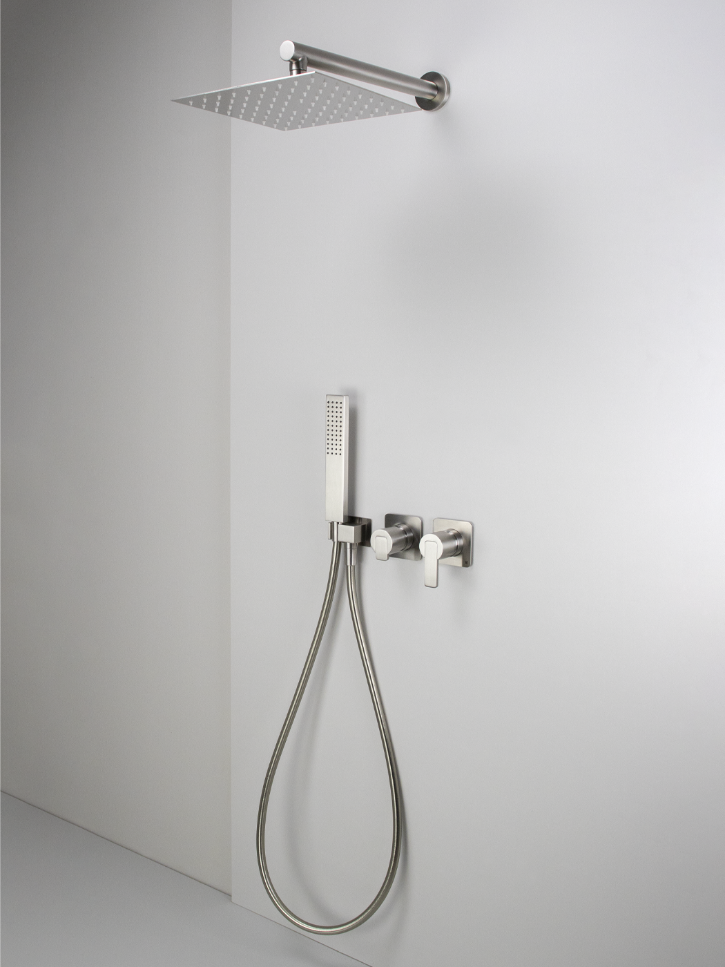 Kit doccia 2 vie con braccio doccia a parete 35cm, soffione 25cm, miscelatore monocomando Ø45mm con deviatore rotativo e doccetta in acciaio inox 316L