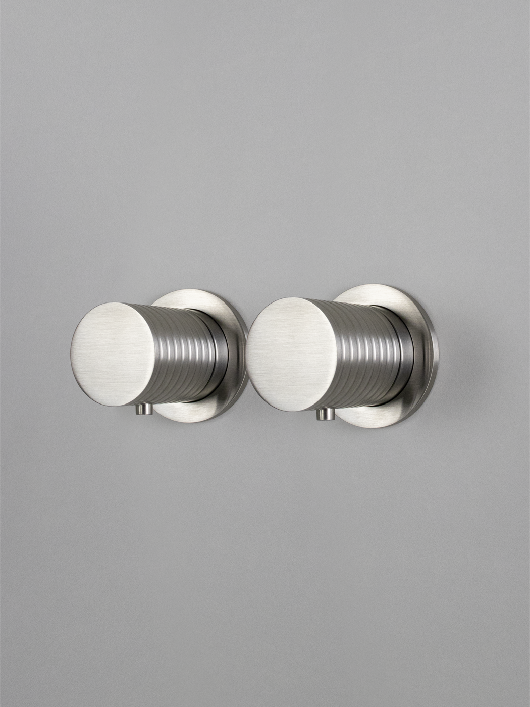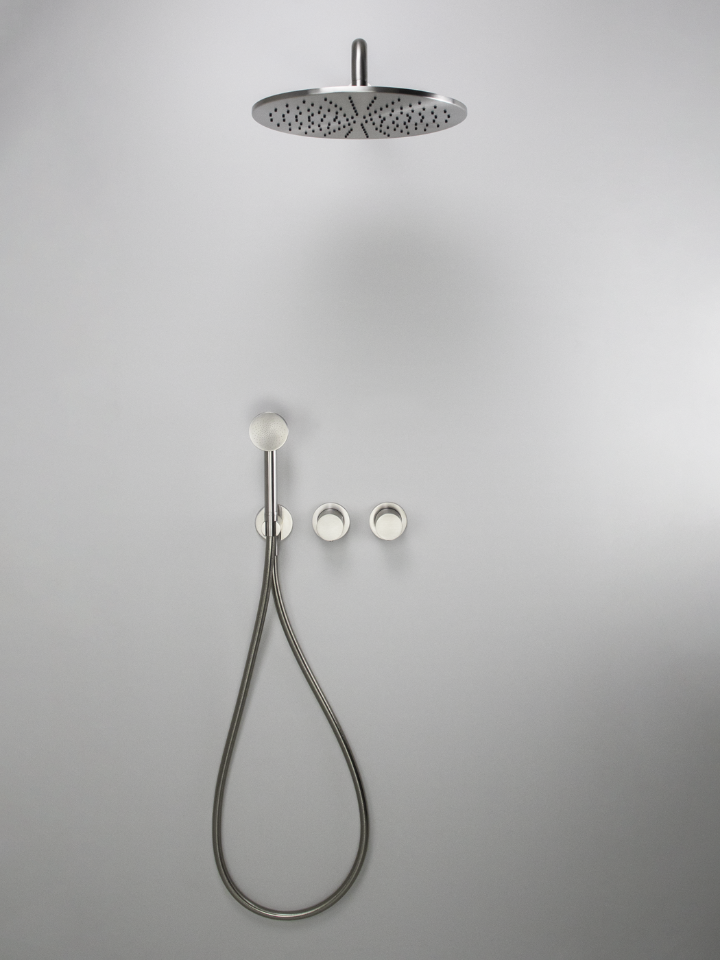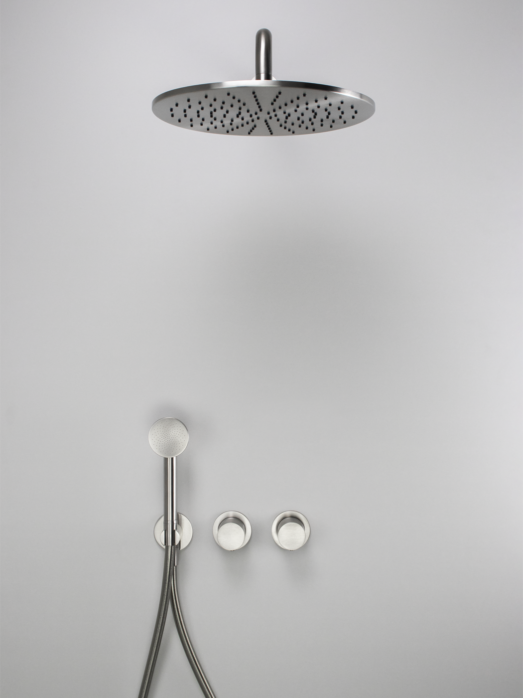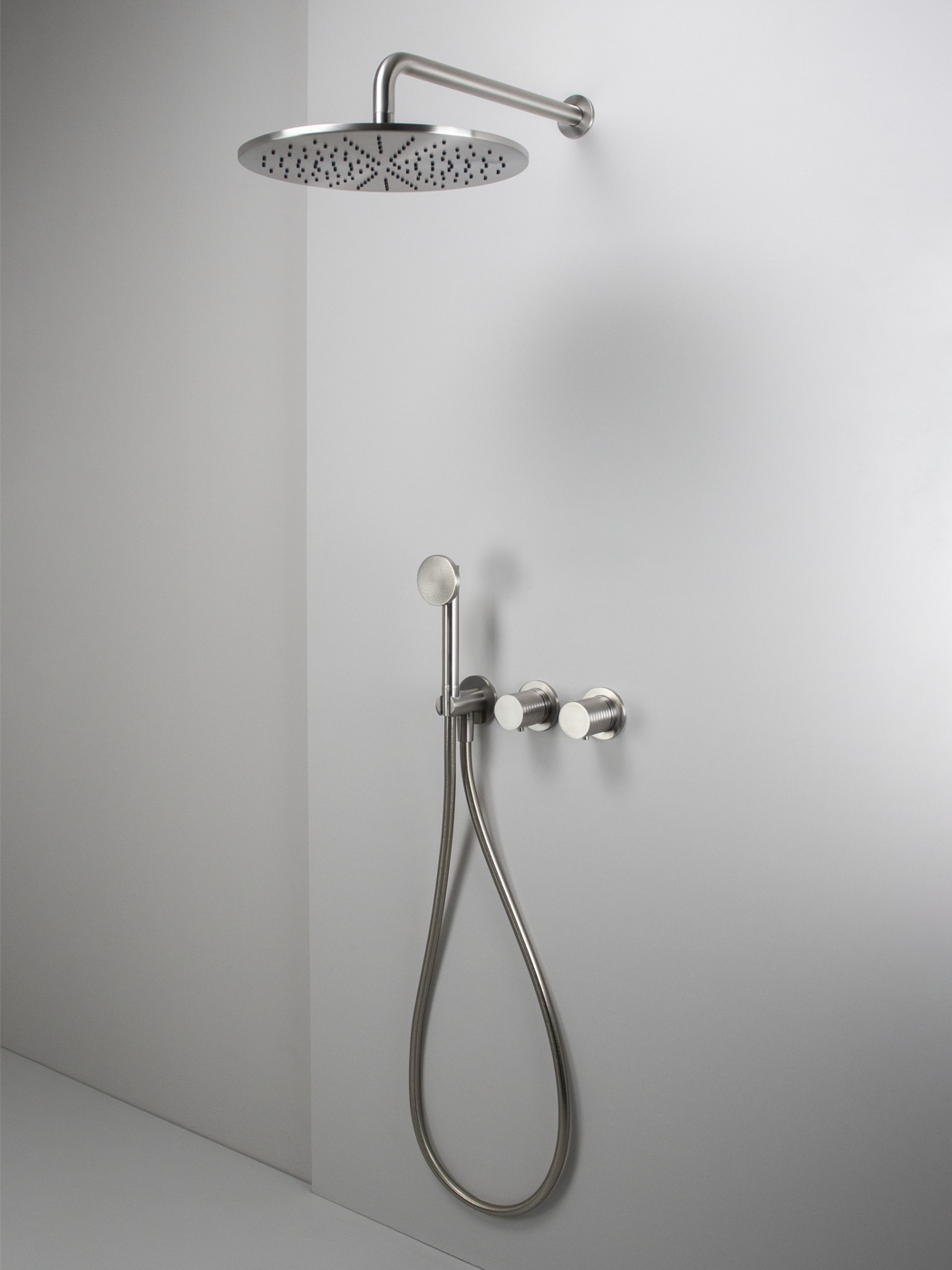 Kit doccia 2 vie con braccio doccia a parete 35cm, soffione Ø300, miscelatore idroprogressivo Ø45mm con deviatore rotativo e doccetta inox 316L