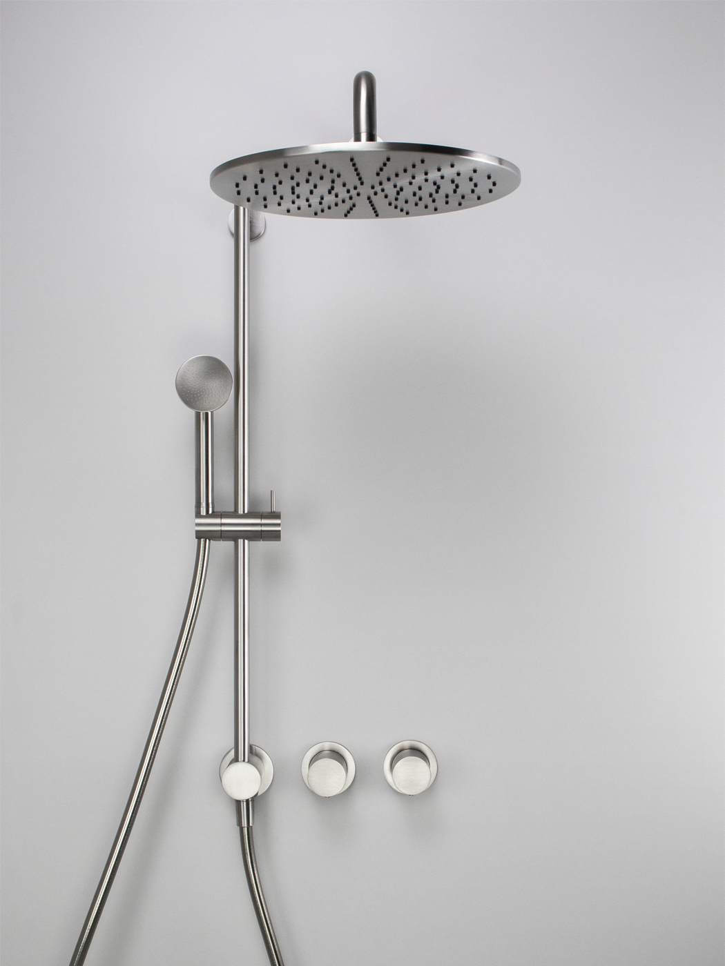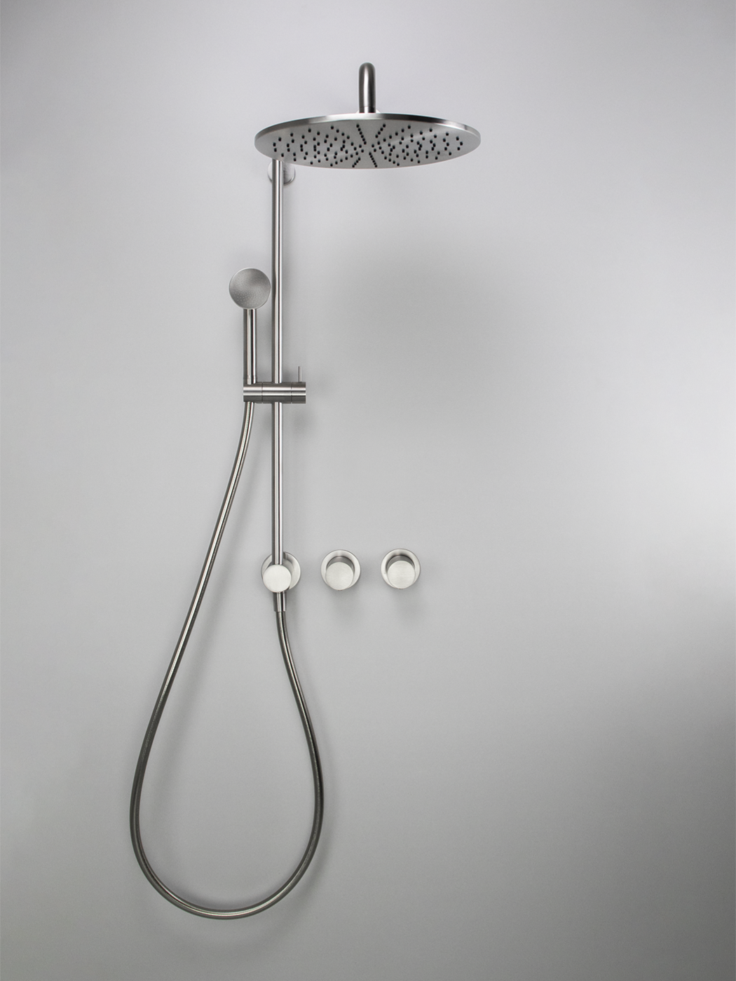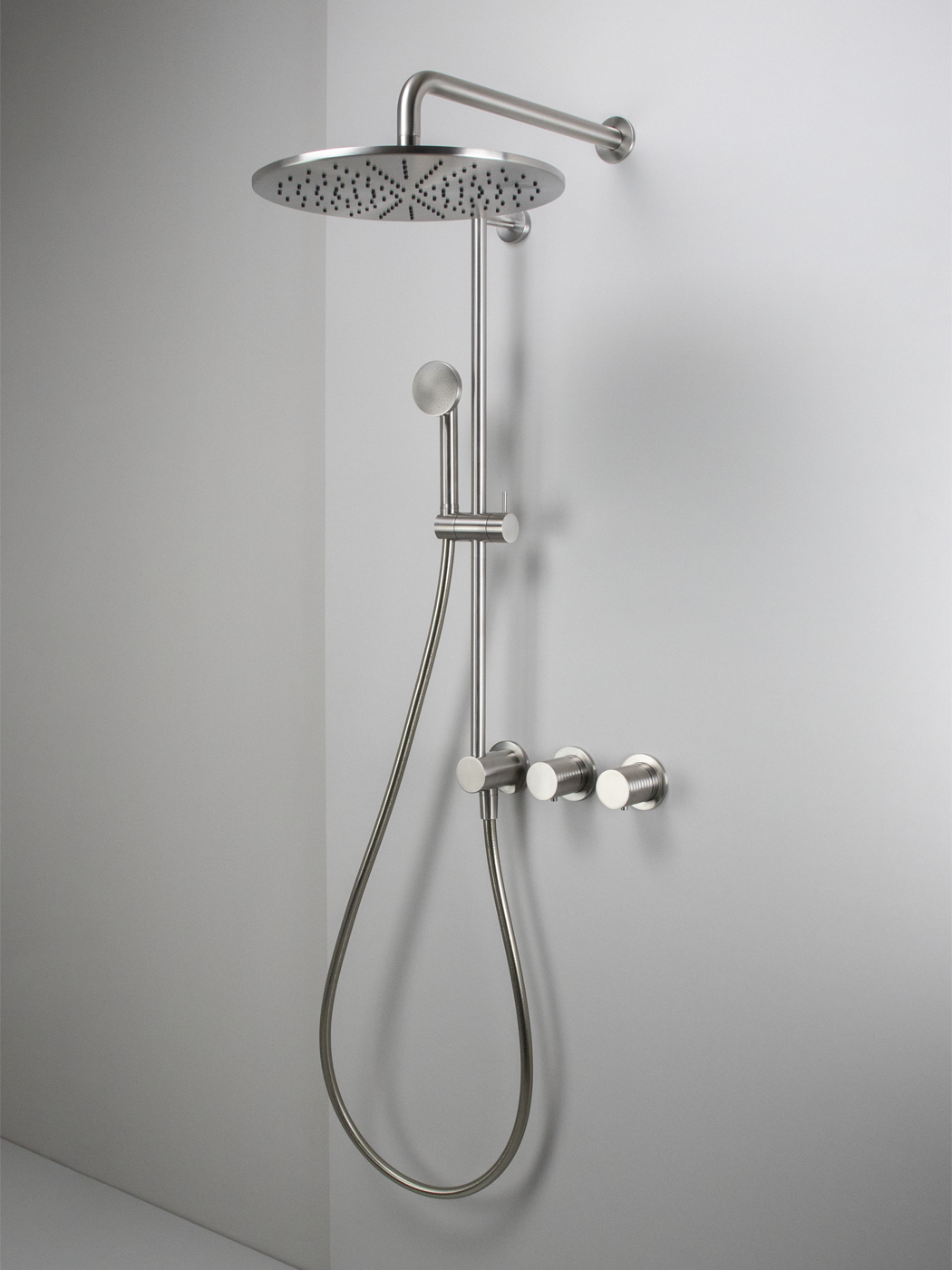 Kit doccia 2 vie con braccio doccia a parete 35cm, soffione Ø300, miscelatore idroprogressivo Ø45mm con deviatore rotativo e asta saliscendi con presa acqua integrata in acciaio inox 316L.
