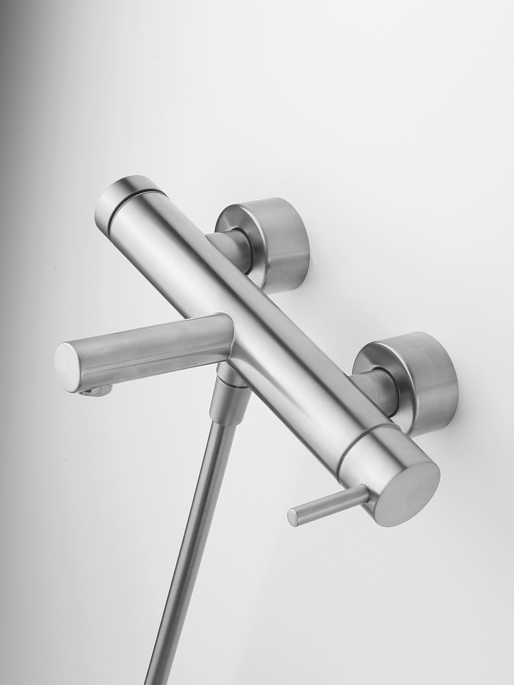 Duvara monte küvet bataryası Ø45mm inox 316L Otomatik geri dönüşlü çekme yön değiştirici Kireç önleyici havalandırıcılı çıkış ucu M24x1 G1/2” bağlantılı